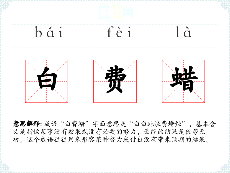 成语“白费蜡”字面意思是“白白地浪费蜡烛”,基本含义是指做某事没有效果或没有必要的努力,最终的结果是徒劳无功。这个成语往往用来形容某种努力或付出没有带来预期的结果。