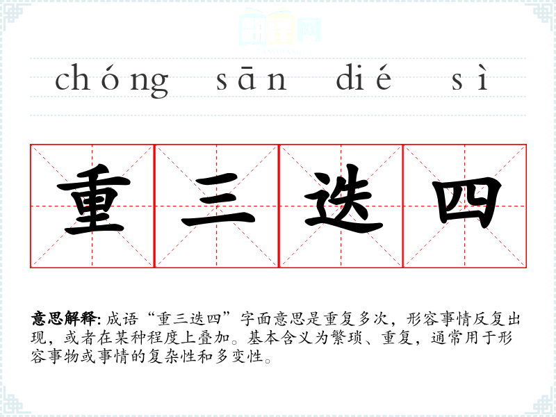 成语“重三迭四”字面意思是重复多次,形容事情反复出现,或者在某种程度上叠加。基本含义为繁琐、重复,通常用于形容事物或事情的复杂性和多变性。