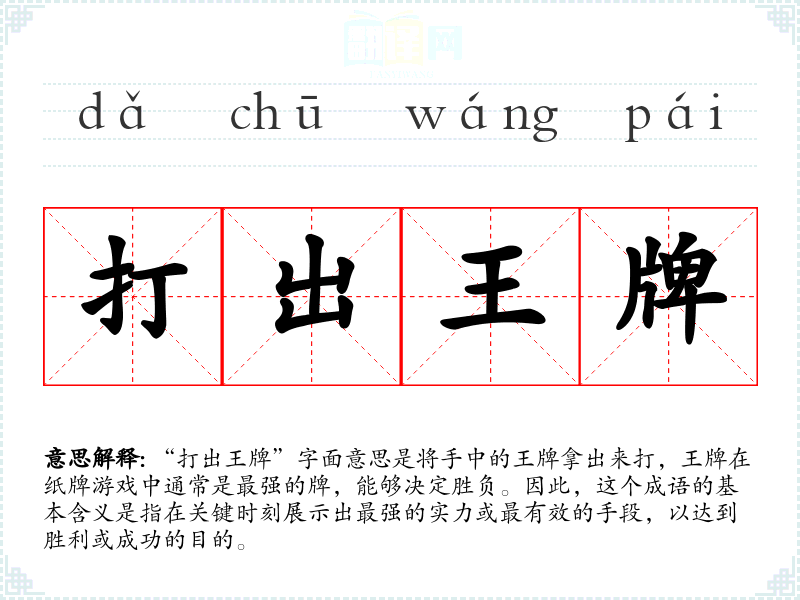 “打出王牌”字面意思是将手中的王牌拿出来打,王牌在纸牌游戏中通常是最强的牌,能够决定胜负。因此,这个成语的基本含义是指在关键时刻展示出最强的实力或最有效的手段,以达到胜利或成功的目的。
