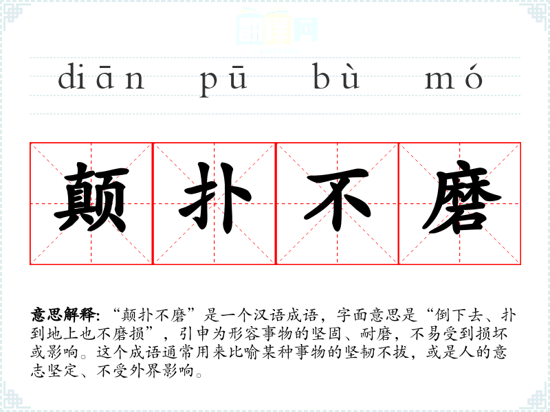 “颠扑不磨”是一个汉语成语,字面意思是“倒下去、扑到地上也不磨损”,引申为形容事物的坚固、耐磨,不易受到损坏或影响。这个成语通常用来比喻某种事物的坚韧不拔,或是人的意志坚定、不受外界影响。