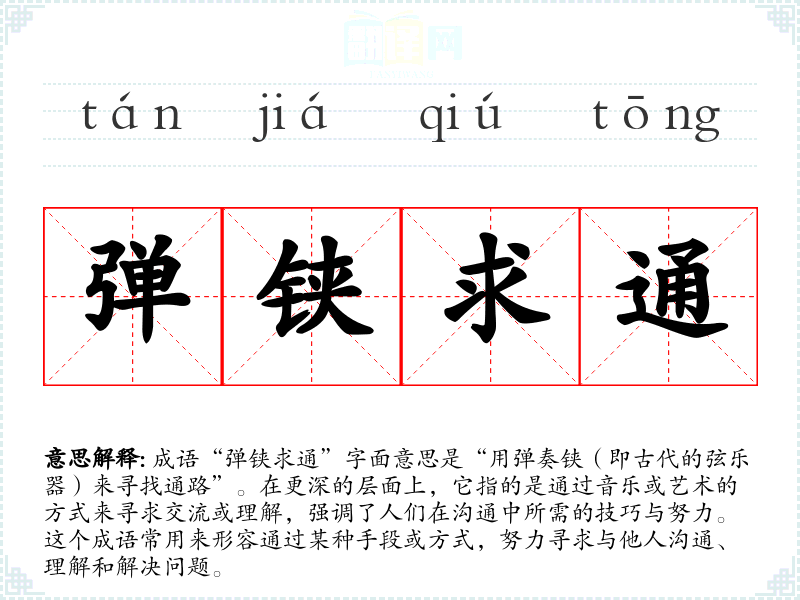 成语“弹铗求通”字面意思是“用弹奏铗(即古代的弦乐器)来寻找通路”。在更深的层面上,它指的是通过音乐或艺术的方式来寻求交流或理解,强调了人们在沟通中所需的技巧与努力。这个成语常用来形容通过某种手段或方式,努力寻求与他人沟通、理解和解决问题。