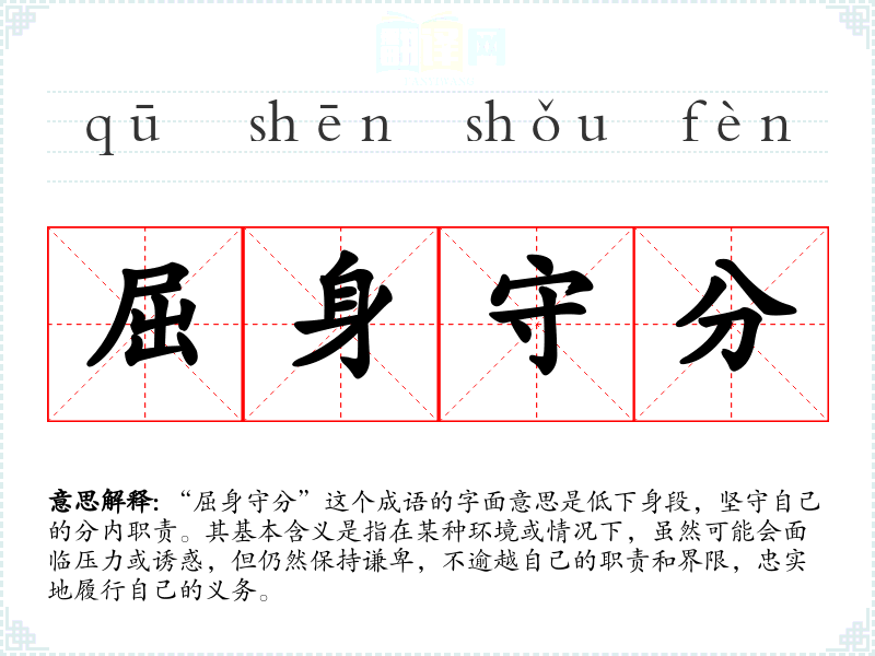 “屈身守分”这个成语的字面意思是低下身段,坚守自己的分内职责。其基本含义是指在某种环境或情况下,虽然可能会面临压力或诱惑,但仍然保持谦卑,不逾越自己的职责和界限,忠实地履行自己的义务。