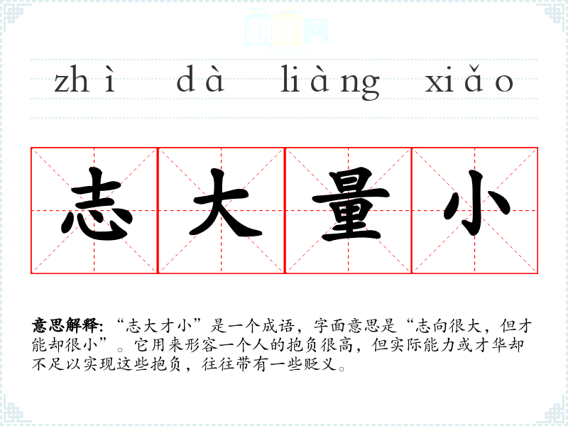 “志大才小”是一个成语,字面意思是“志向很大,但才能却很小”。它用来形容一个人的抱负很高,但实际能力或才华却不足以实现这些抱负,往往带有一些贬义。