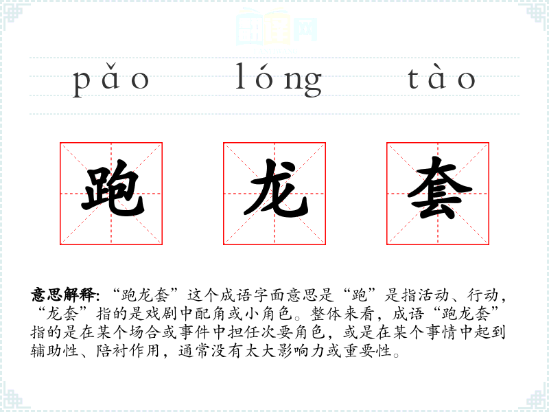 | 跑龙套 | 原指戏曲中拿着旗子做兵卒的角色,后比喻在人手下做无关紧要的事。 |