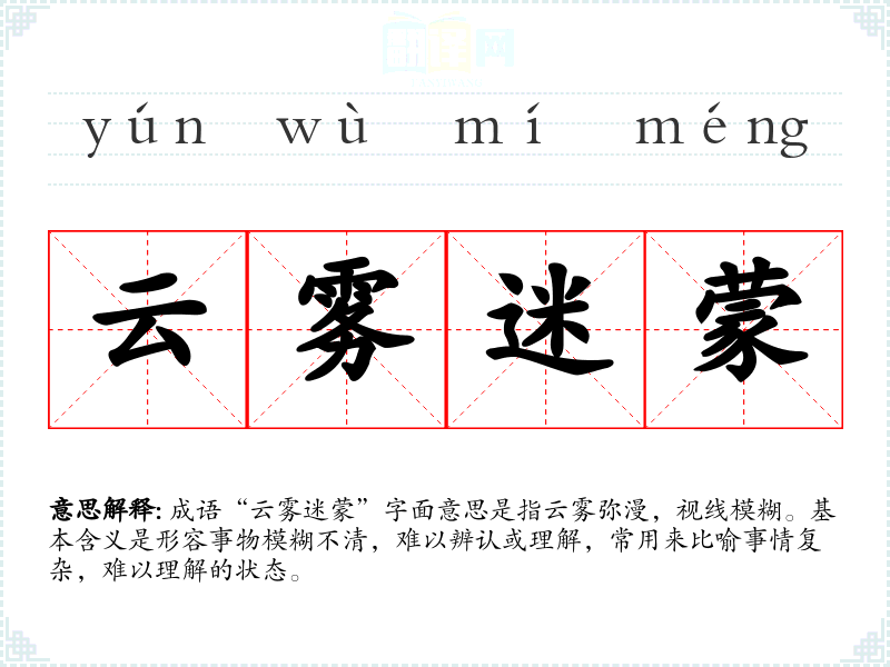 “云雾迷蒙”并没有特定的历史典故,但其构成的词汇“云雾”在古代文学中经常出现,常用来描绘自然景观或象征神秘与不可知的事物。成语的形成反映了人们对自然现象的观察,以及对模糊不清状态的普遍感受。