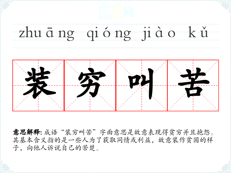 成语“装穷叫苦”字面意思是故意表现得贫穷并且抱怨。其基本含义指的是一些人为了获取同情或利益,故意装作贫困的样子,向他人诉说自己的苦楚。