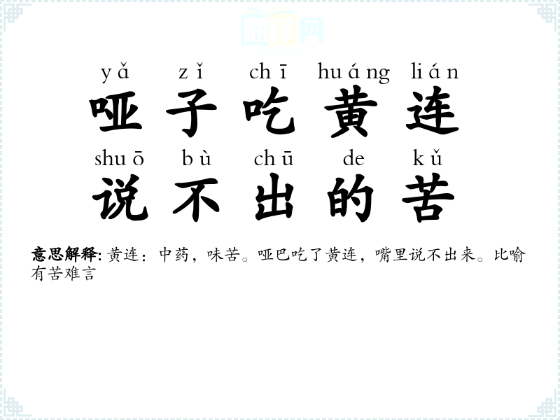黄连:中药,味苦。哑巴吃了黄连,嘴里说不出来。比喻有苦难言 |