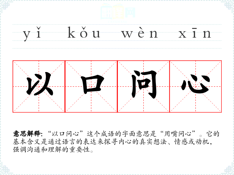 “以口问心”这个成语的字面意思是“用嘴问心”。它的基本含义是通过语言的表达来探寻内心的真实想法、情感或动机,强调沟通和理解的重要性。
