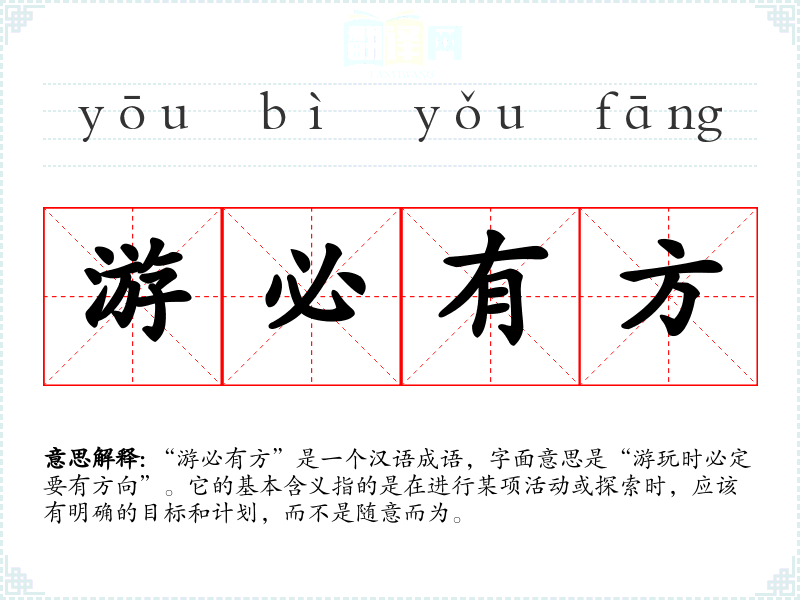 “游必有方”是一个汉语成语,字面意思是“游玩时必定要有方向”。它的基本含义指的是在进行某项活动或探索时,应该有明确的目标和计划,而不是随意而为。