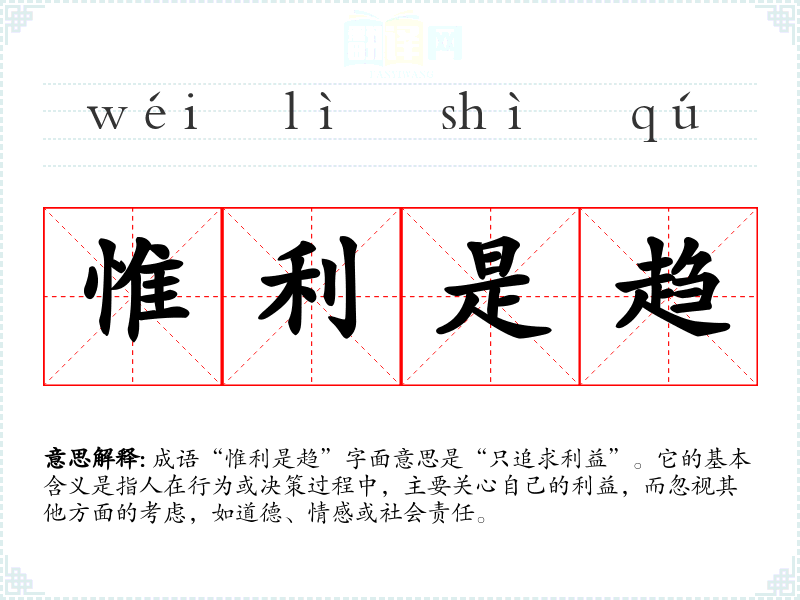 成语“惟利是趋”字面意思是“只追求利益”。它的基本含义是指人在行为或决策过程中,主要关心自己的利益,而忽视其他方面的考虑,如道德、情感或社会责任。