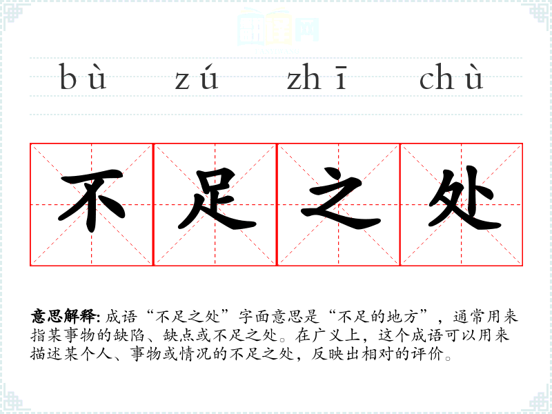 成语“不足之处”字面意思是“不足的地方”,通常用来指某事物的缺陷、缺点或不足之处。在广义上,这个成语可以用来描述某个人、事物或情况的不足之处,反映出相对的评价。