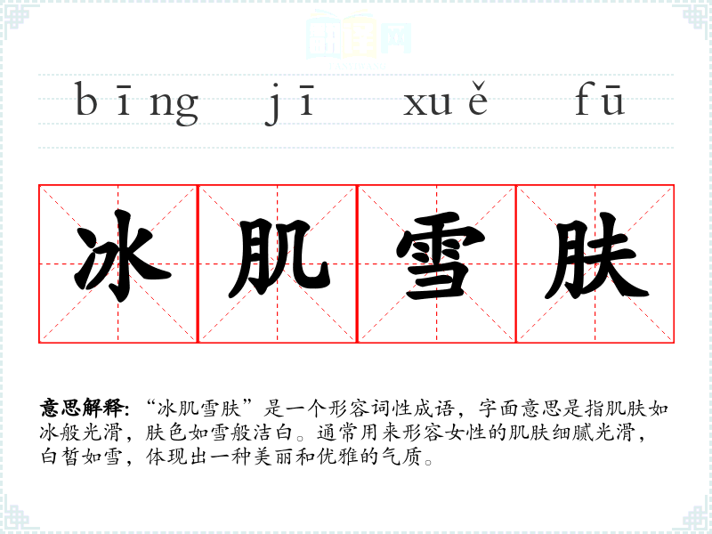 | 冰肌雪肤 | 像冰一样的肌肤。形容女子洁美的体肤。 |