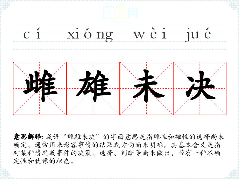 在英语中,可以用“undecided”或“at a crossroads”来表达类似的含义。但这些表达方式在文化语境下,可能缺乏“雌雄未决”所蕴含的动物性选择的细腻性。