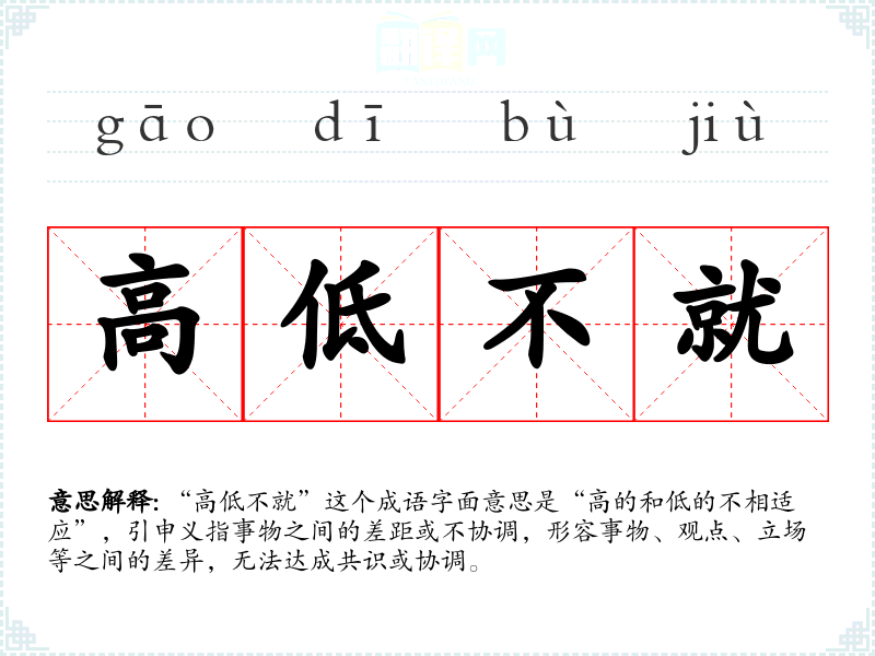 “高低不就”这个成语字面意思是“高的和低的不相适应”,引申义指事物之间的差距或不协调,形容事物、观点、立场等之间的差异,无法达成共识或协调。