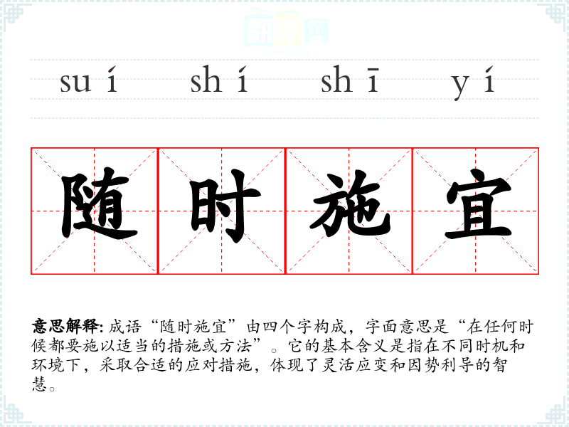 成语“随时施宜”由四个字构成,字面意思是“在任何时候都要施以适当的措施或方法”。它的基本含义是指在不同时机和环境下,采取合适的应对措施,体现了灵活应变和因势利导的智慧。