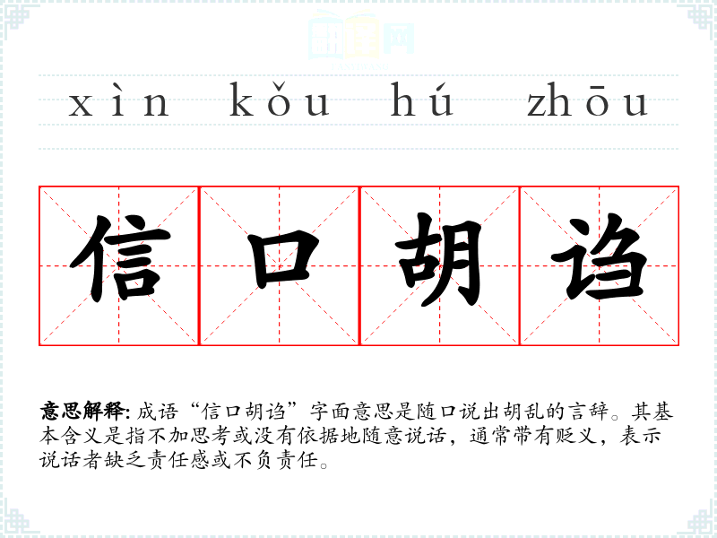 成语“信口胡诌”字面意思是随口说出胡乱的言辞。其基本含义是指不加思考或没有依据地随意说话,通常带有贬义,表示说话者缺乏责任感或不负责任。