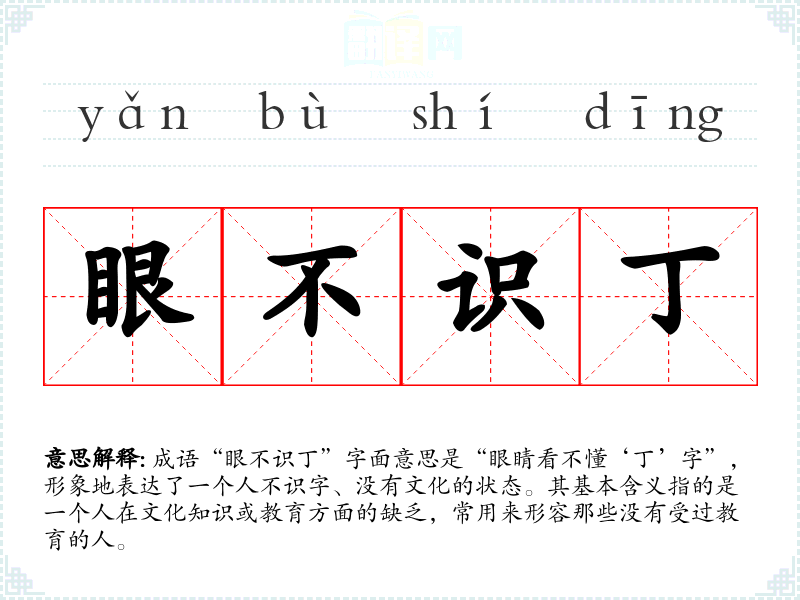 成语“眼不识丁”字面意思是“眼睛看不懂‘丁’字”,形象地表达了一个人不识字、没有文化的状态。其基本含义指的是一个人在文化知识或教育方面的缺乏,常用来形容那些没有受过教育的人。