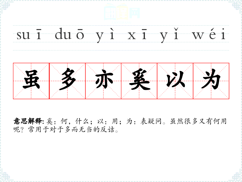 | 虽多亦奚为 | 奚:何,什么;以:用;为:表疑问。虽然很多又有何用呢?常用于对于多而无当的反诘。 |