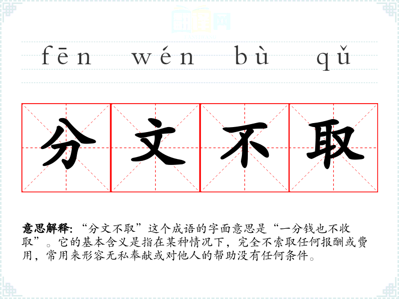 “分文不取”这个成语的字面意思是“一分钱也不收取”。它的基本含义是指在某种情况下,完全不索取任何报酬或费用,常用来形容无私奉献或对他人的帮助没有任何条件。