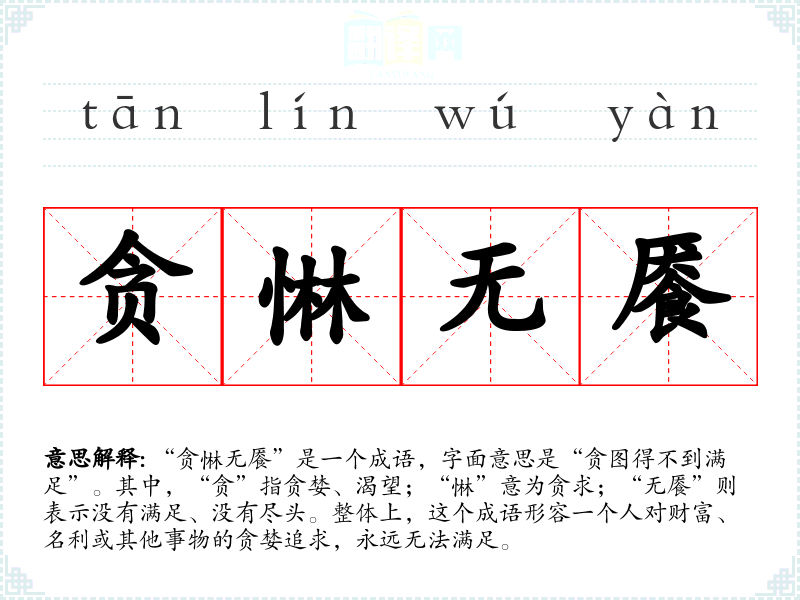 “贪惏无餍”是一个成语,字面意思是“贪图得不到满足”。其中,“贪”指贪婪、渴望;“惏”意为贪求;“无餍”则表示没有满足、没有尽头。整体上,这个成语形容一个人对财富、名利或其他事物的贪婪追求,永远无法满足。