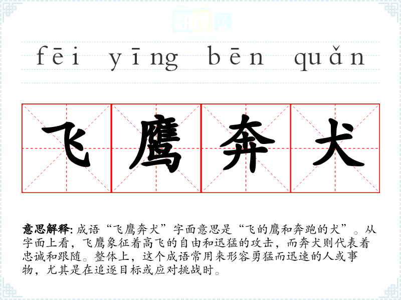 成语“飞鹰奔犬”字面意思是“飞的鹰和奔跑的犬”。从字面上看,飞鹰象征着高飞的自由和迅猛的攻击,而奔犬则代表着忠诚和跟随。整体上,这个成语常用来形容勇猛而迅速的人或事物,尤其是在追逐目标或应对挑战时。