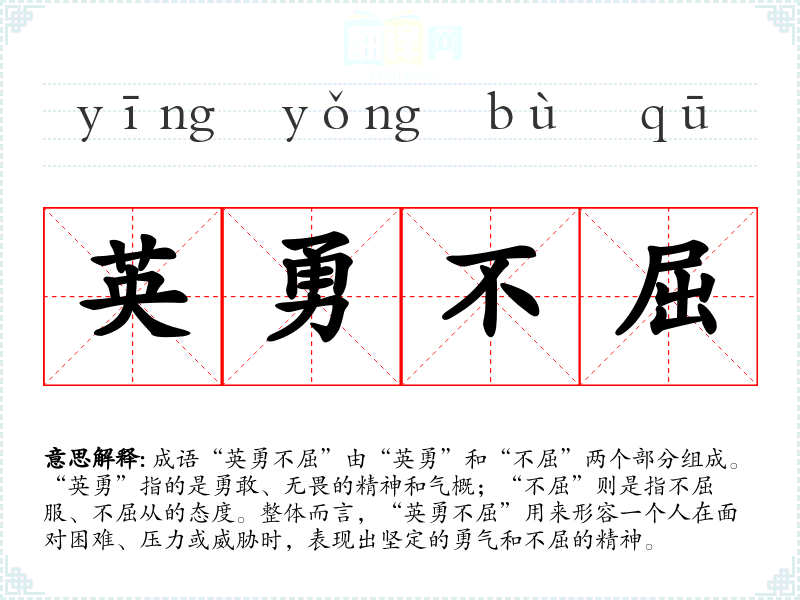成语“英勇不屈”由“英勇”和“不屈”两个部分组成。“英勇”指的是勇敢、无畏的精神和气概;“不屈”则是指不屈服、不屈从的态度。整体而言,“英勇不屈”用来形容一个人在面对困难、压力或威胁时,表现出坚定的勇气和不屈的精神。