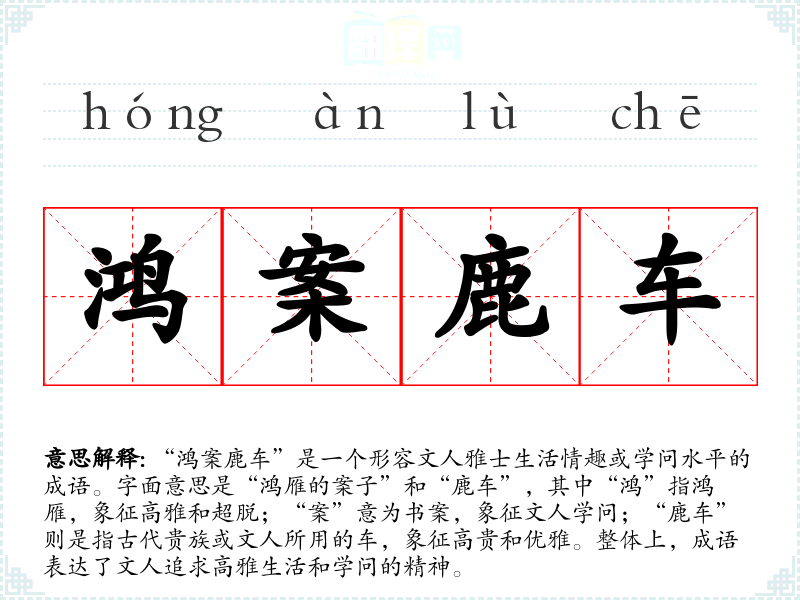 “鸿案鹿车”是一个形容文人雅士生活情趣或学问水平的成语。字面意思是“鸿雁的案子”和“鹿车”,其中“鸿”指鸿雁,象征高雅和超脱;“案”意为书案,象征文人学问;“鹿车”则是指古代贵族或文人所用的车,象征高贵和优雅。整体上,成语表达了文人追求高雅生活和学问的精神。