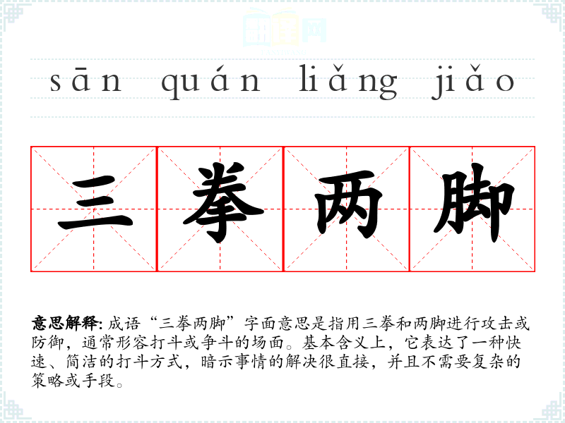 成语“三拳两脚”字面意思是指用三拳和两脚进行攻击或防御,通常形容打斗或争斗的场面。基本含义上,它表达了一种快速、简洁的打斗方式,暗示事情的解决很直接,并且不需要复杂的策略或手段。