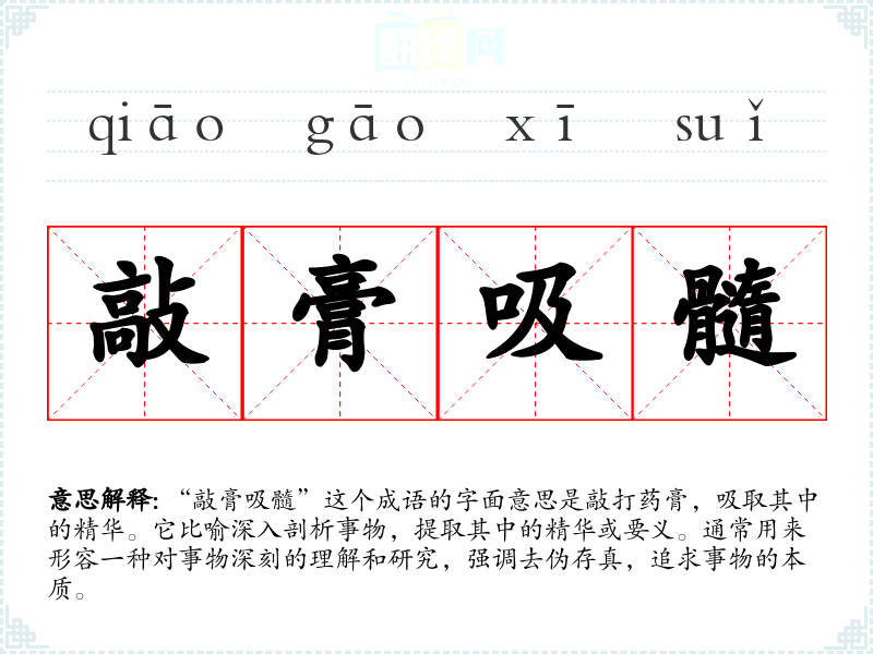 “敲膏吸髓”这个成语的字面意思是敲打药膏,吸取其中的精华。它比喻深入剖析事物,提取其中的精华或要义。通常用来形容一种对事物深刻的理解和研究,强调去伪存真,追求事物的本质。