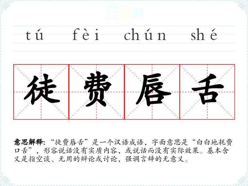 “徒费唇舌”是一个汉语成语,字面意思是“白白地耗费口舌”,形容说话没有实质内容,或说话而没有实际效果。基本含义是指空谈、无用的辩论或讨论,强调言辞的无意义。
