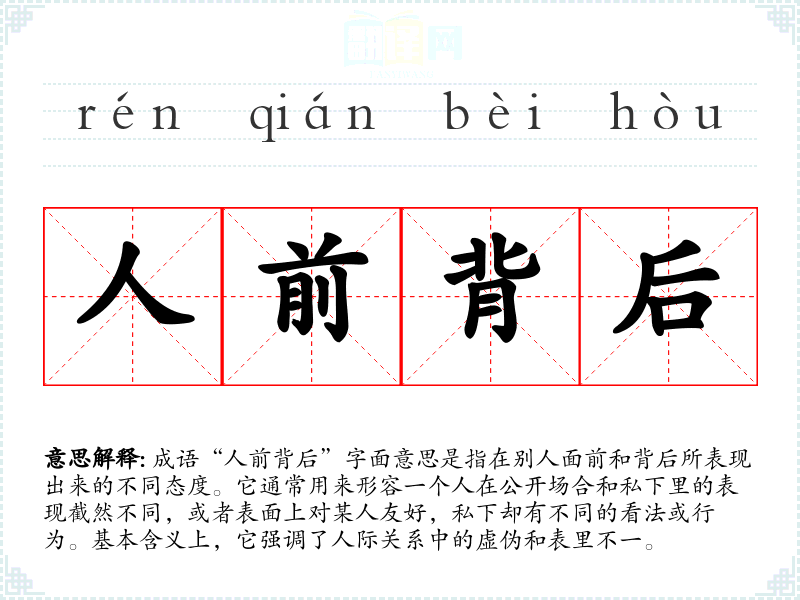 成语“人前背后”字面意思是指在别人面前和背后所表现出来的不同态度。它通常用来形容一个人在公开场合和私下里的表现截然不同,或者表面上对某人友好,私下却有不同的看法或行为。基本含义上,它强调了人际关系中的虚伪和表里不一。
