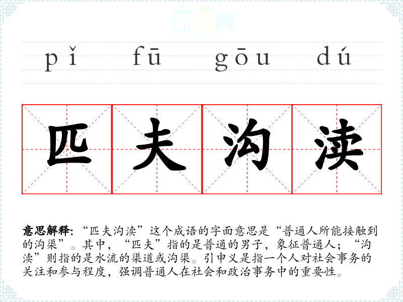 “匹夫沟渎”这个成语的字面意思是“普通人所能接触到的沟渠”。其中,“匹夫”指的是普通的男子,象征普通人;“沟渎”则指的是水流的渠道或沟渠。引申义是指一个人对社会事务的关注和参与程度,强调普通人在社会和政治事务中的重要性。