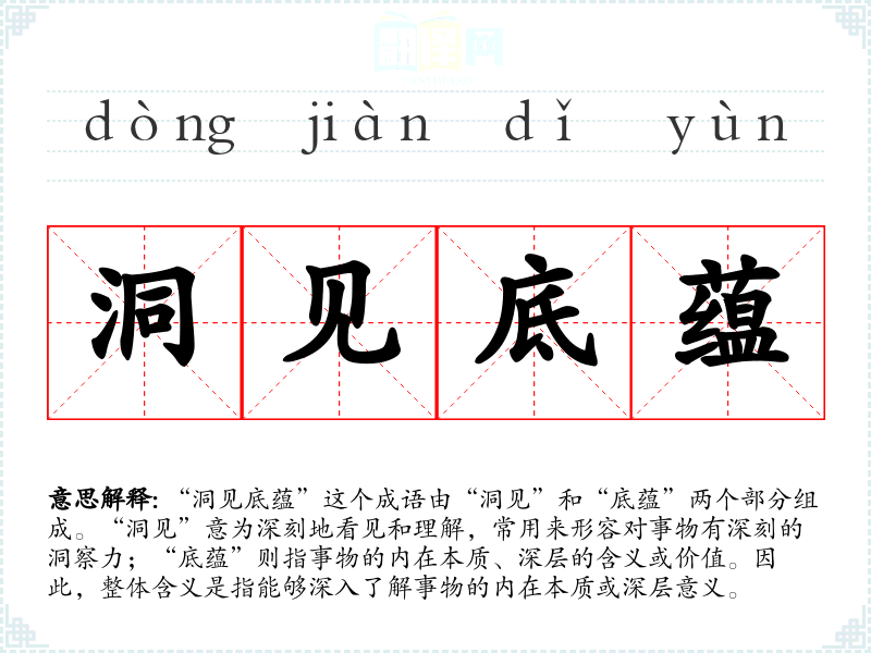 | 洞见底蕴 | 洞见:清楚地看到;底蕴:内情,事情的具体内容。透彻地观察到事物的详细内情。 |