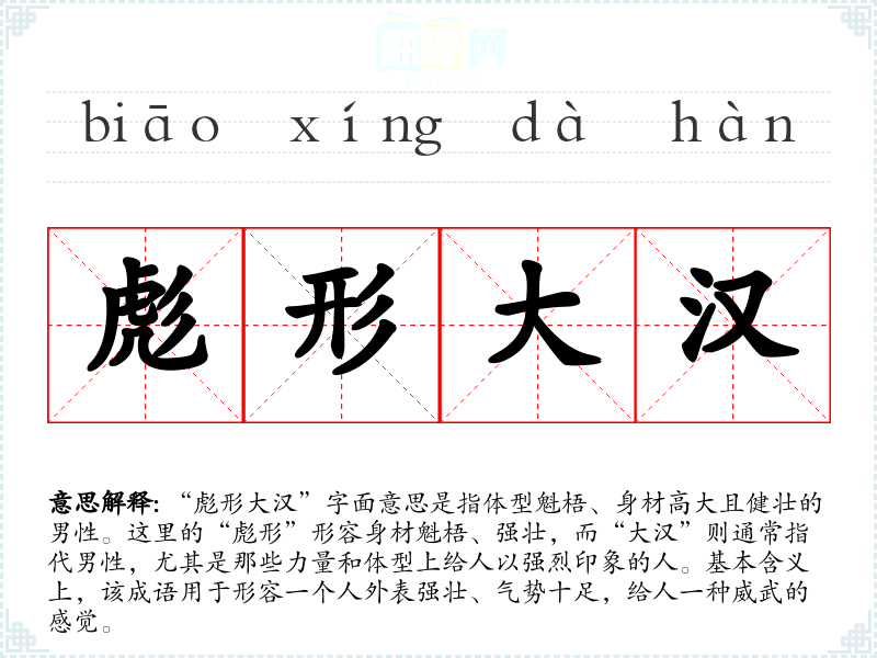 “彪形大汉”字面意思是指体型魁梧、身材高大且健壮的男性。这里的“彪形”形容身材魁梧、强壮,而“大汉”则通常指代男性,尤其是那些力量和体型上给人以强烈印象的人。基本含义上,该成语用于形容一个人外表强壮、气势十足,给人一种威武的感觉。
