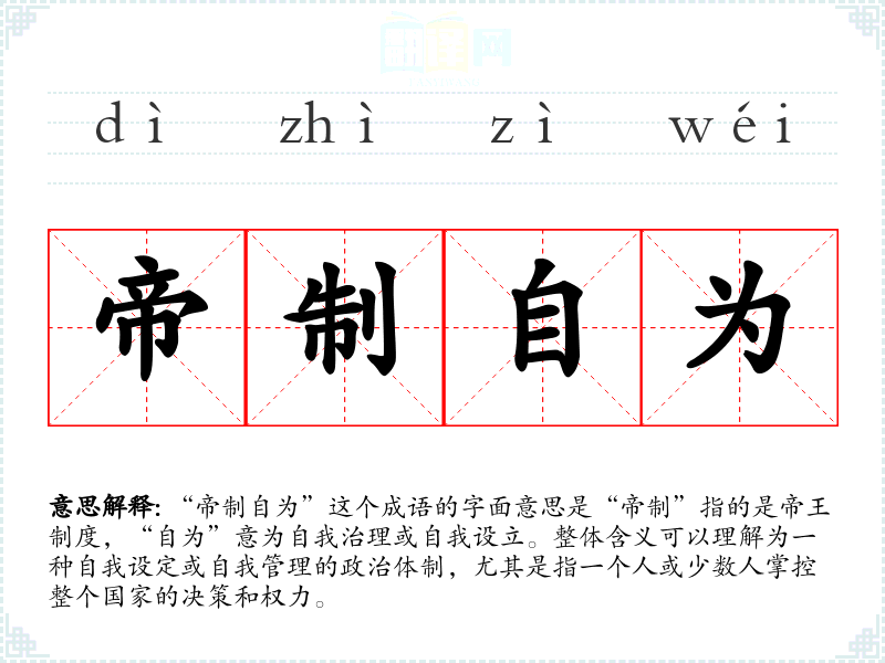 “帝制自为”这个成语的字面意思是“帝制”指的是帝王制度,“自为”意为自我治理或自我设立。整体含义可以理解为一种自我设定或自我管理的政治体制,尤其是指一个人或少数人掌控整个国家的决策和权力。