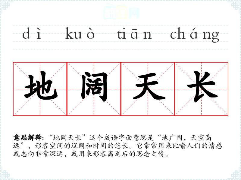 “地阔天长”这个成语字面意思是“地广阔,天空高远”,形容空间的辽阔和时间的悠长。它常常用来比喻人们的情感或志向非常深远,或用来形容离别后的思念之情。