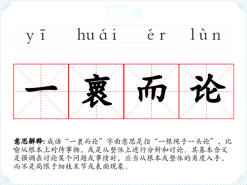 成语“一褱而论”字面意思是指“一根绳子一头论”,比喻从根本上对待事物,或是从整体上进行分析和讨论。其基本含义是强调在讨论某个问题或事情时,应当从根本或整体的角度入手,而不是局限于细枝末节或表面现象。