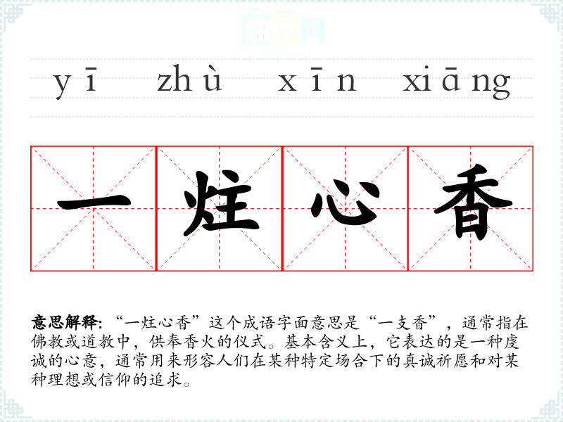 “一炷心香”来源于文化,香火在中是供奉神灵和祖先的传统,象征着对神灵的敬仰和祈祷。历史上,信徒在寺庙中点燃香火,表示心中对佛祖的敬意和愿望。成语的具体出处可能较难追溯,但在古代文人的诗词中常常提到供香的场景。