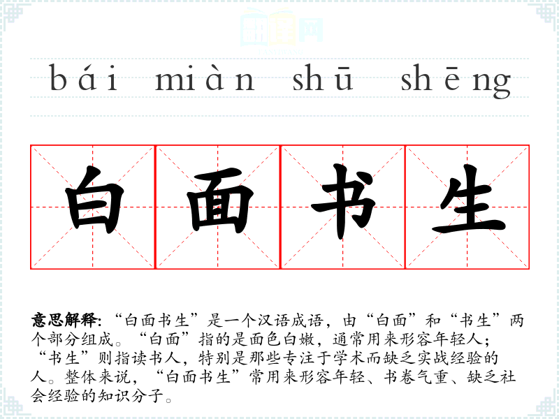 “白面书生”是一个汉语成语,由“白面”和“书生”两个部分组成。“白面”指的是面色白嫩,通常用来形容年轻人;“书生”则指读书人,特别是那些专注于学术而缺乏实战经验的人。整体来说,“白面书生”常用来形容年轻、书卷气重、缺乏社会经验的知识分子。