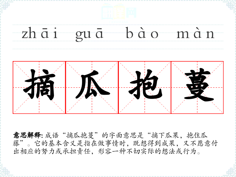 成语“摘瓜抱蔓”的字面意思是“摘下瓜果,抱住瓜藤”。它的基本含义是指在做事情时,既想得到成果,又不愿意付出相应的努力或承担责任,形容一种不切实际的想法或行为。