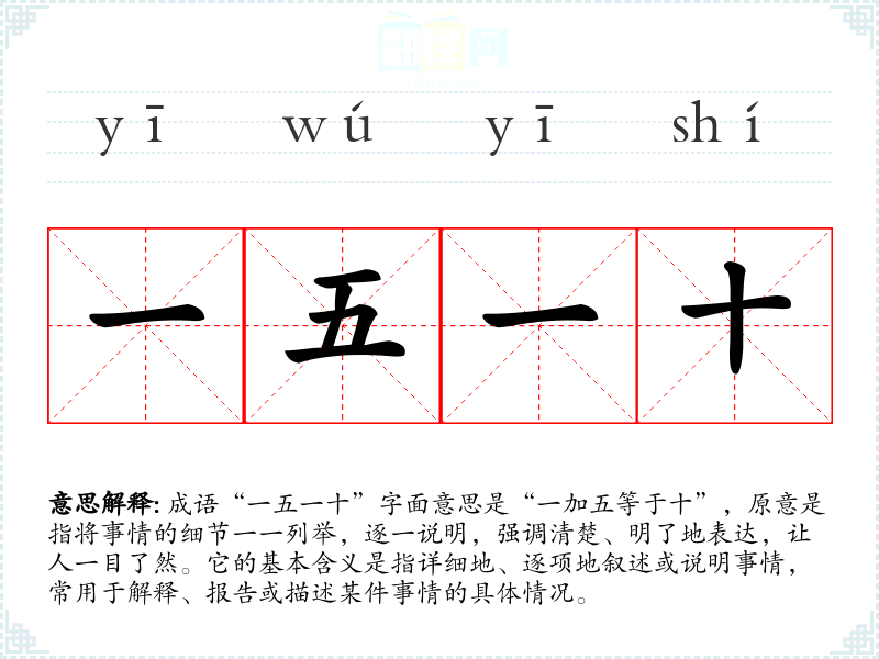 成语“一五一十”字面意思是“一加五等于十”,原意是指将事情的细节一一列举,逐一说明,强调清楚、明了地表达,让人一目了然。它的基本含义是指详细地、逐项地叙述或说明事情,常用于解释、报告或描述某件事情的具体情况。