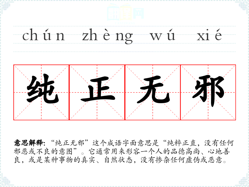 “纯正无邪”这个成语字面意思是“纯粹正直,没有任何邪恶或不良的意图”。它通常用来形容一个人的品德高尚、心地善良,或是某种事物的真实、自然状态,没有掺杂任何虚伪或恶意。