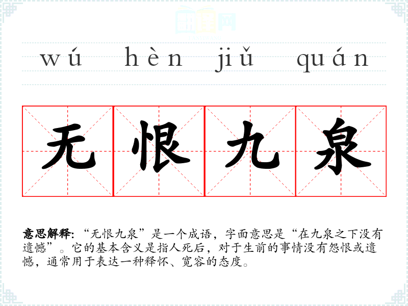 “无恨九泉”是一个成语,字面意思是“在九泉之下没有遗憾”。它的基本含义是指人死后,对于生前的事情没有怨恨或遗憾,通常用于表达一种释怀、宽容的态度。