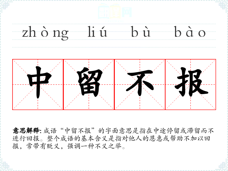 成语“中留不报”的字面意思是指在中途停留或滞留而不进行回报。整个成语的基本含义是指对他人的恩惠或帮助不加以回报,常带有贬义,强调一种不义之举。