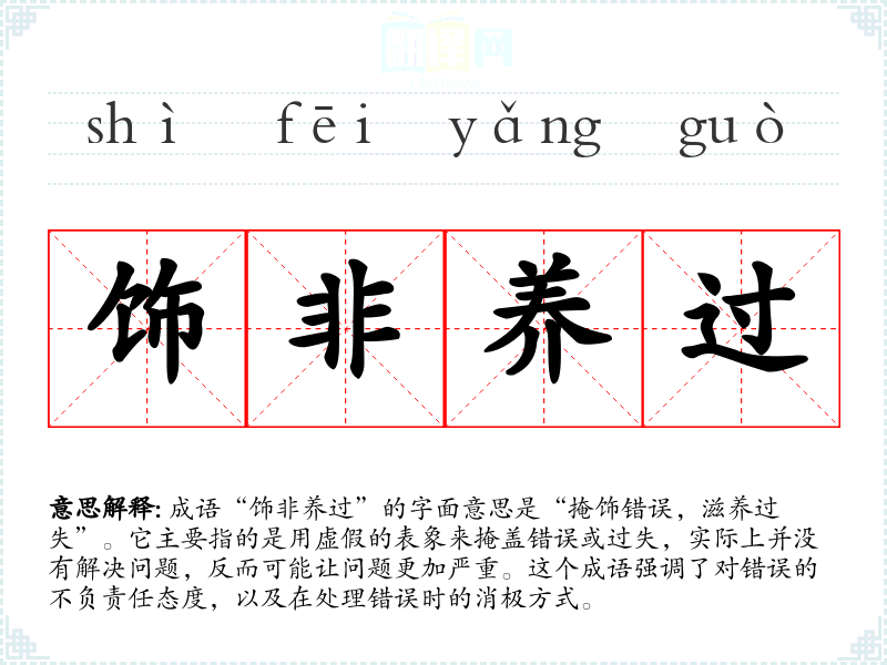 成语“饰非养过”的字面意思是“掩饰错误,滋养过失”。它主要指的是用虚假的表象来掩盖错误或过失,实际上并没有解决问题,反而可能让问题更加严重。这个成语强调了对错误的不负责任态度,以及在处理错误时的消极方式。