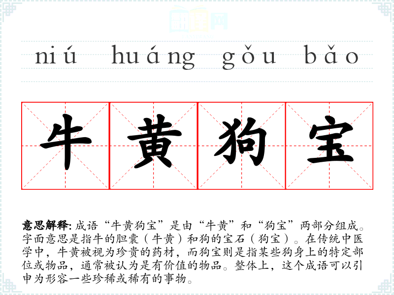 成语“牛黄狗宝”是由“牛黄”和“狗宝”两部分组成。字面意思是指牛的胆囊(牛黄)和狗的宝石(狗宝)。在传统中医学中,牛黄被视为珍贵的药材,而狗宝则是指某些狗身上的特定部位或物品,通常被认为是有价值的物品。整体上,这个成语可以引申为形容一些珍稀或稀有的事物。