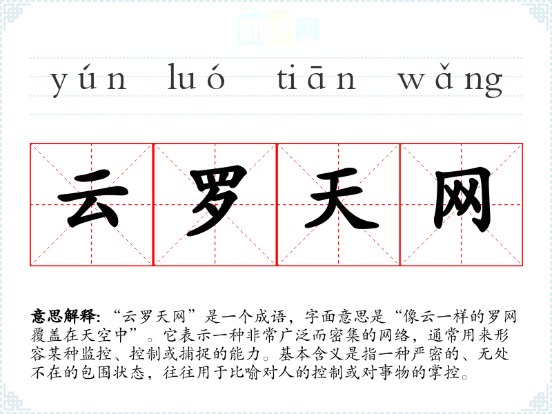 “云罗天网”是一个成语,字面意思是“像云一样的罗网覆盖在天空中”。它表示一种非常广泛而密集的网络,通常用来形容某种监控、控制或捕捉的能力。基本含义是指一种严密的、无处不在的包围状态,往往用于比喻对人的控制或对事物的掌控。