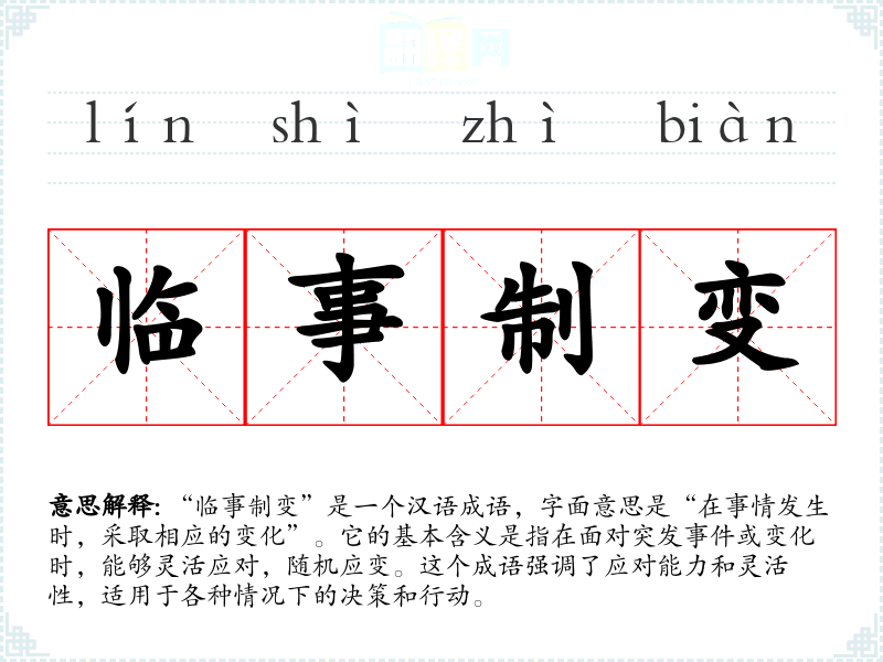 “临事制变”是一个汉语成语,字面意思是“在事情发生时,采取相应的变化”。它的基本含义是指在面对突发**或变化时,能够灵活应对,随机应变。这个成语强调了应对能力和灵活性,适用于各种情况下的决策和行动。