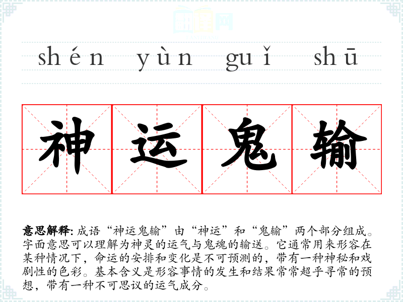 成语“神运鬼输”由“神运”和“鬼输”两个部分组成。字面意思可以理解为神灵的运气与鬼魂的输送。它通常用来形容在某种情况下,命运的安排和变化是不可预测的,带有一种神秘和戏剧性的色彩。基本含义是形容事情的发生和结果常常超乎寻常的预想,带有一种不可思议的运气成分。