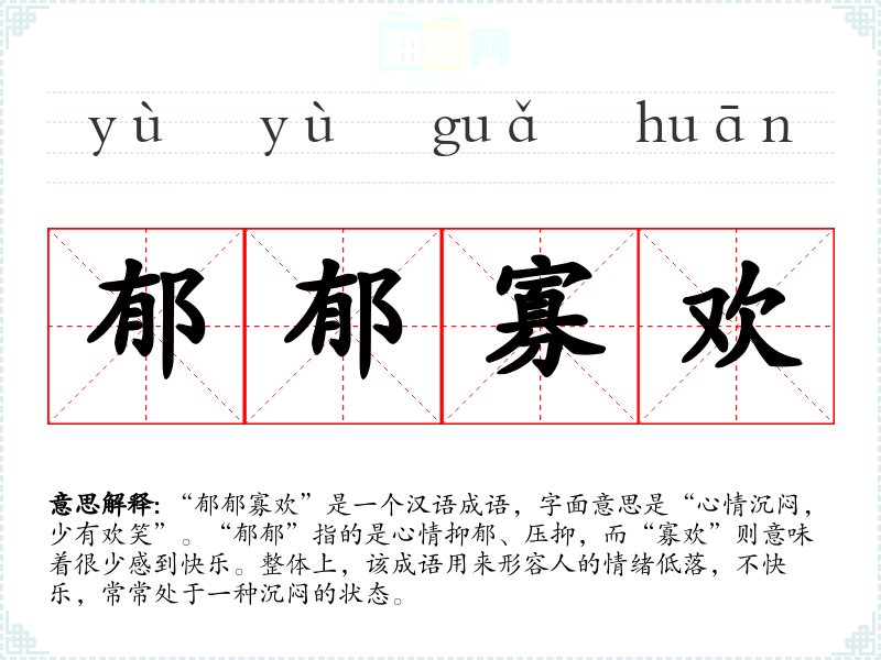 “郁郁寡欢”是一个汉语成语,字面意思是“心情沉闷,少有欢笑”。“郁郁”指的是心情抑郁、压抑,而“寡欢”则意味着很少感到快乐。整体上,该成语用来形容人的情绪低落,不快乐,常常处于一种沉闷的状态。